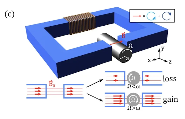 不过实验团队并没有放弃,4年后,同一个科研团队在《自然·通讯》(Nature Communications)上发表论文,他们成功观测到了旋转物体对电磁波的放大作用。他们用LC振荡电路实现了低频的电磁波,并在电路中放置了一个快速旋转的铝圆柱体。当铝圆柱体旋转速度超过振荡电路的频率时,振荡电路的磁场会被放大。铝不具备磁性,所以磁场的放大并不是某种发电机效应的结果,旋转物体真的可以放大电磁波。