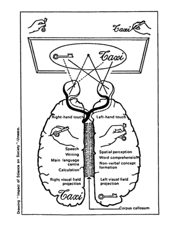 在那个连大脑前额叶都敢切的年代,临床上的行为总是显得非常激进。人类的胼胝体切除手术(或者说裂脑手术)在争议中取得了成功,手术几乎完全消除了癫痫发作,甚至单侧发作也消除了。患者在术后恢复一段时间后,看上去也大体正常。当然,临床手术不同于动物实验,医生保留了患者的视神经交叉,手术只切断了胼胝体。所以裂脑人左脑仍主要享有右眼视觉,右脑仍主要享有左眼视觉。