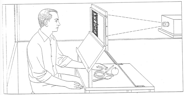 实验示意图。图片来源:Gazzaniga, M. S. (1967). The split brain in man.Scientific American, 217(2), 24–29.