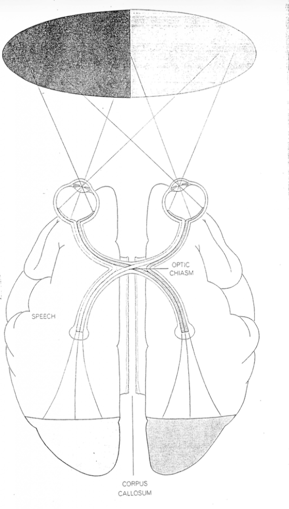 当视神经交叉和胼胝体被一并左右切断后,猫的左、右脑就分别只能收到左、右眼的视觉信号了。图片来源:Gazzaniga, M. S. (1967). The split brain in man. Scientific American, 217(2), 24–29.