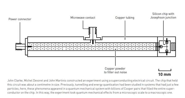 约翰·克拉克、米歇尔·德沃雷和约翰·马蒂尼斯使用超导电路构建了一个实验。承载该电路的芯片大约一厘米大小。此前,隧穿和能量量子化的研究都是在只有少数粒子的系统中进行的;而在这里,这些现象出现在一个量子力学系统中,该系统具有数十亿个库珀对,填充了芯片上的整个超导体。通过这种方式,该实验将量子力学效应从微观尺度带到了宏观尺度。