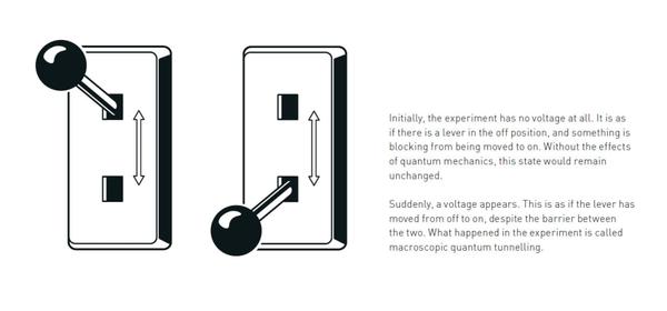 最初,实验中完全没有电压。这就好比有一个处于关闭位置的开关,有某种东西阻止它被移动到开启位置。如果没有量子力学的效应,这种状态将保持不变。突然,电压出现了。这就好像开关从关闭移动到了开启位置,尽管两者之间存在障碍。实验中发生的这种现象被称为宏观量子隧穿。