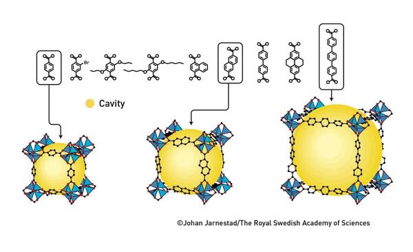 图6. 在21世纪初,亚吉展示了生产整个MOF材料家族是可能的。他改变了分子连接体,从而得到了具有不同性质的材料。其中包括16种MOF-5的变体,其孔穴大小各异。©Johan Jarnestad/瑞典皇家科学院