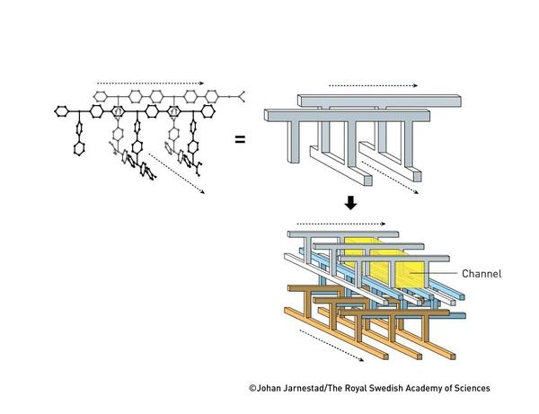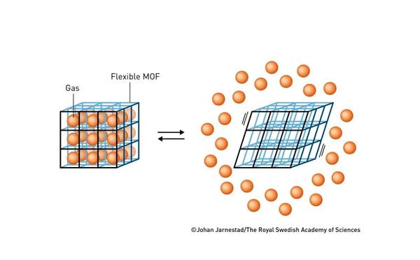 图3. 1997年,北川进成功创造出一种具有开放通道的金属有机框架。这些通道可以填充不同种类的气体。该材料可以在其结构不受影响的情况下释放这些气体。©Johan Jarnestad/瑞典皇家科学院