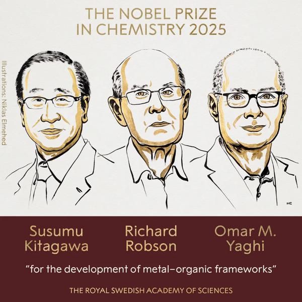 2025 年 10 月 8 日北京时间 17 时 45 分许,北川进(Susumu Kitagawa,日本)、理查德·罗布森 (Richard Robson,英国)、奥马尔·M.亚吉(Omar M. Yaghi,约旦裔美国籍) 因对金属有机框架发展的贡献,获得 2025 年诺贝尔化学奖。