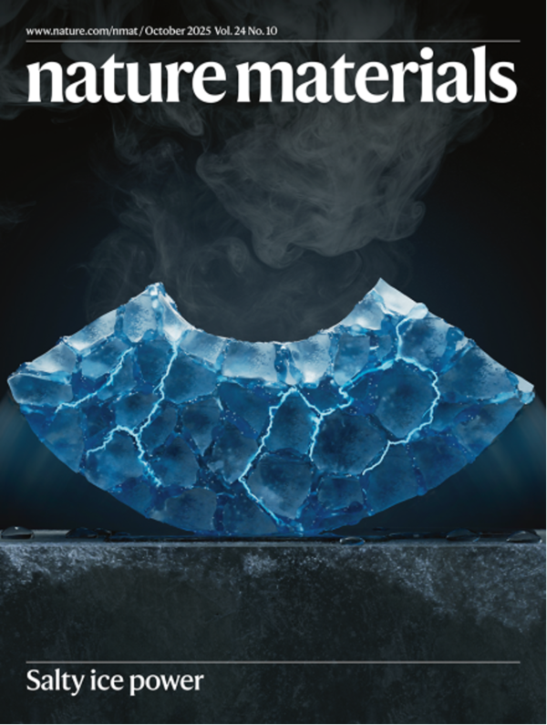 在海洋或人类体液中,盐是最常见的一种溶质。研究团队自然想到,将氯化钠掺入冰里来尝试增强这一效应。他们很快便通过实验发现,弯曲盐水冻结的盐冰,其产电能力,或者说挠曲电系数,会随温度增加而增长,最高相比纯冰有上千倍的增强。但最令人震惊的是,盐冰弯曲产电的机制与纯冰完全不同。这项研究在《自然·物理学》研究发表后,很快以封面形式发表在《自然·材料学》(Nature Materials)上。