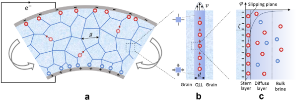 “这一个非常巧妙的结构,”团队成员解释道,由于晶界电双层的存在,准液体层中的钠离子能相对自由、快速地移动,而冰内部又有四通八达的准液体层纳米通道,“此时对盐冰施加一个弯曲力,就能让纳离子在这些纳米通道中定向流动起来,形成离子电流。”这种全新的产电机制,与挠曲电效应完全不同,被研究团队命名为挠曲流电效应。