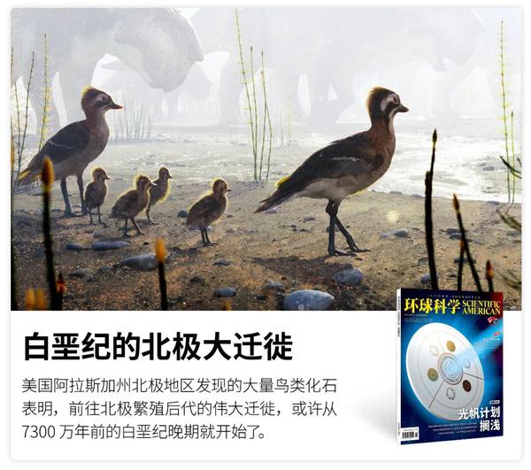 北极夏日的极昼让这里成为了鸟类绝佳的繁殖地。如今,每年春天都有数十亿只鸟类飞行几万千米,前往北极繁殖后代,再飞回南极追逐南半球的夏天。美国阿拉斯加州北极地区发现的大量鸟类化石表明,这场伟大的迁徙或许从7300万年前的白垩纪晚期就开始了。当时今鸟类在繁殖和发育方面的演化创新,也许让它们能够短暂地在北极栖息,在这片严酷的土地上找到延续生命的新希望。