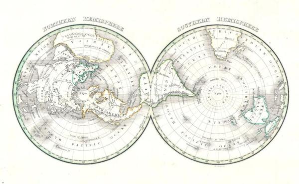 19世纪描绘南北半球的地图。图片来源:Thomas Gamaliel Bradford/Wikipedia