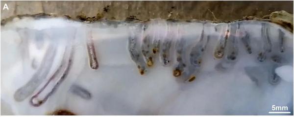 现生海稚虫在牡蛎壳表面钻出的U形孔道(图片来源:Vasily Radishevsky/ Far Eastern Branch of the Russian Academy of Sciences)