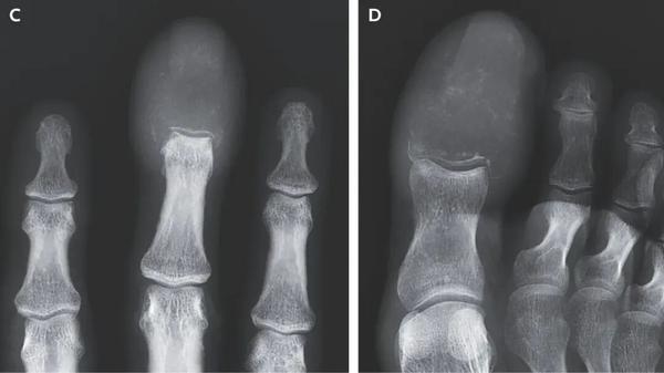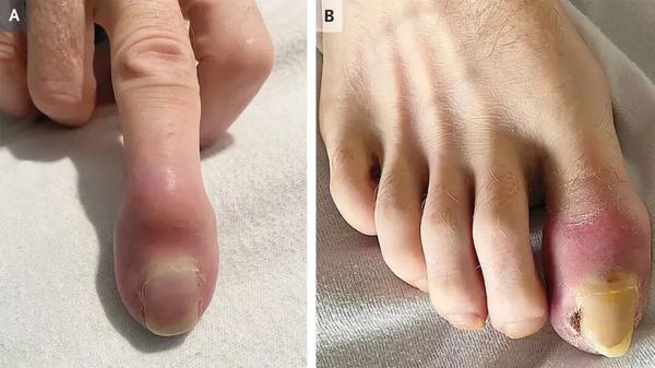 7月16日,《新英格兰医学杂志》(NEJM)发表了一份这样的病例报告:一名55岁的患者在6周内右手的中指和大脚趾接连出现疼痛和肿胀,指甲附近还长出了溃疡。