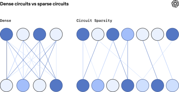 在常规的密集神经网络中,每个神经元都与下一层的每个神经元相连。而在稀疏模型中,每个神经元只与下一层的几个神经元相连。OpenAI希望这能让神经元以及整个网络更容易理解。图片来源:OpenAI