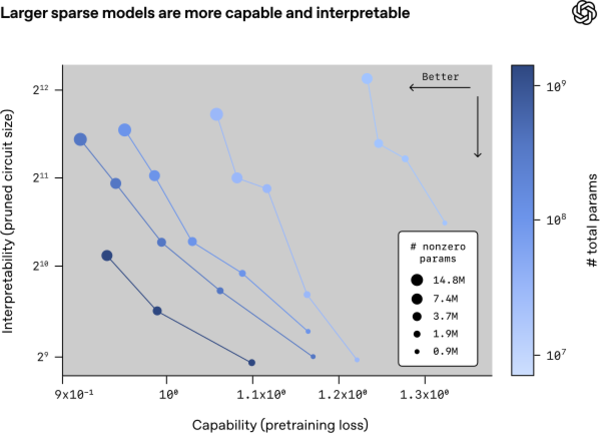 横轴为模型的性能,越靠左越好;纵轴为模型的可解释性,越靠下越好。数据点的颜色代表模型的总参数量,颜色越深代表总参数量越大;数据点的大小表示模型中非零参数的数量,点越大表示非零参数越多。对于总参数量相同的模型,模型中非零参数越多,性能越强,可解释性越差;非零参数越少,性能越差,可解释性越强。要想同时提升模型的性能和可解释性(靠左下),需要提升模型的总参数规模。图片来源:OpenAI