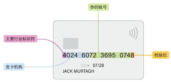 拿出一张银行卡,你会发现卡号的结构远比表面上看起来复杂。一个银行卡卡号的构成包括四个主要部分。以我个人的Visa卡为例: