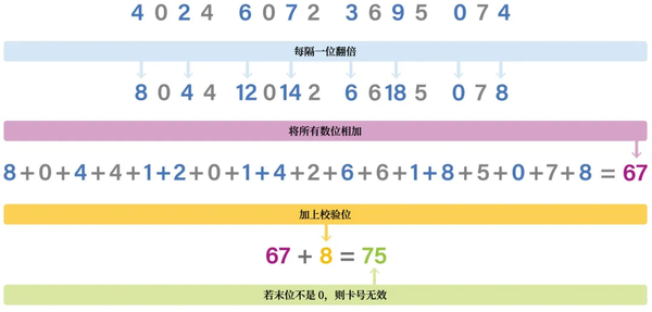 4.将总和加上校验位。若末位不是0,则卡号无效。