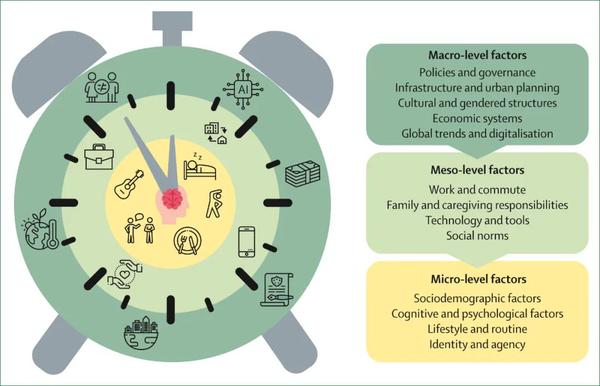 最近,一项发表于《柳叶刀··老龄健康》(The Lancet Healthy Longevity)的观点文章就指出,时间是影响大脑健康的一个重要社会因素,却总是被忽略。许多成年人缺乏足够的运动,这不仅是因为懒惰,更多的是因为一种现代病——时间贫困。