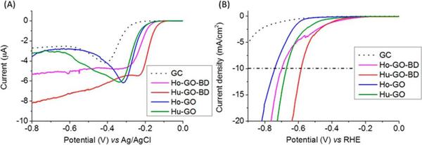 (A)ORR和(B)HER的线性循环伏安图:与未掺杂石墨烯相比,鸟屎掺杂的石墨烯(包括图中显示的Ho-GO-BD和Hu-GO-BD)均表现出较低的起始电位。图片来源:原论文