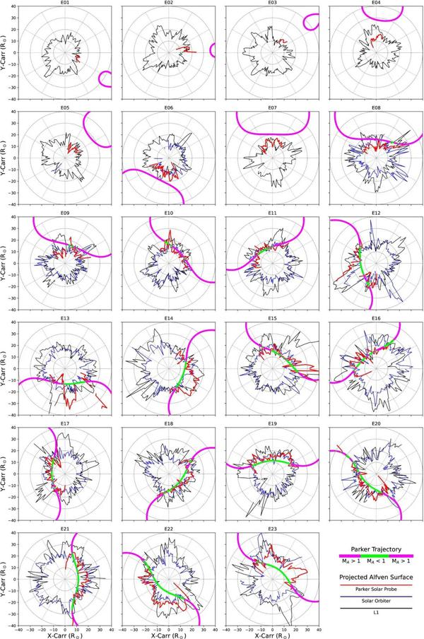 对太阳物理学家而言,帕克探测器在阿尔文表面内外穿梭几次的数据,并不足以还原边界的全貌。除了近距离、离散地采集数据,也需要远处探测器提供的全局视角。美国哈佛-史密森尼天体物理学中心的太阳物理学家萨姆·巴德曼(Sam Badman,这项研究的第一作者)整合了帕克太阳探测器、太阳轨道飞行器(Solar Orbiter)以及位于地球轨道附近第一拉格朗日点(L1)的多台监测卫星观测数据。数据集的时间尺度覆盖了2018年10月至2025年4月,从太阳活动最少的太阳极小期到太阳极大期的全过程;空间尺度也横跨了0.045天文单位(au,日地平均距离,约1.5亿千米)到1天文单位。