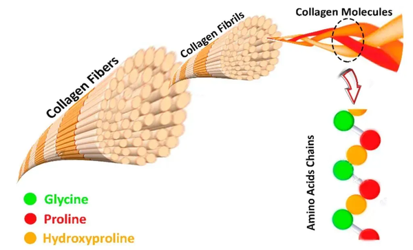 胶原蛋白的氨基酸组成。图中胶原蛋白的氨基酸比例为1个甘氨酸、1个脯氨酸和1个羟脯氨酸。图片来源:Jafari et al., 2020