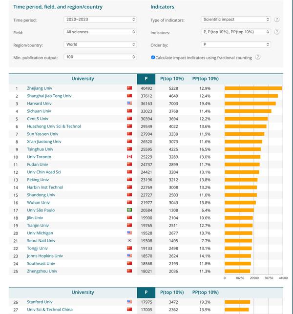 当然,只看论文数量其实很难说明大学的学术水平究竟如何。如果想进一步了解各个大学的排名情况,这个大学排名提供了3个可选排名参数,分别是P、P(top 10%)和PP(top 10%),它们分别对应2020年到2023年大学发表的论文数量,领域内前10%的论文数量和领域内前10%论文的数量占本大学发表论文数量的比例。