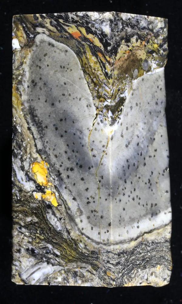Prototaxites taiti化石标本,其内部结构为斑点状。(图片来源:University of Edinburgh)