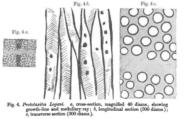 在显微镜下,道森观察到年轮、髓射线以及带有螺旋纹理的细长木质细胞。尽管细胞排列较为松散,与现代树木并不完全一致,但仍足以让道森联想到现在的针叶树木。