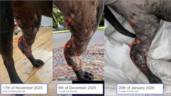 随后,罗茜又接种了一剂加强针。到1月底,腿部肿瘤已显著缩小约75%。康宁汉姆强调,这并非“治愈”——罗茜体内仍有癌细胞,疾病也仍未根除。但她的整体状况明显好转,生活质量大幅提升:原本在2025年12月前后日渐萎靡的她,如今重焕生机,不仅玩起了玩具,还在狗公园里奔跑、冲刺。“一只兔子出现在栅栏另一边,她立刻追过去,跳过栅栏,拼命追赶。”康宁汉姆回忆道。