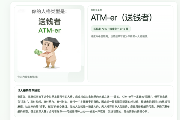 SBTI测试内部也有一套连续的坐标,但它的问题和MBTI一样,最终输出结果只是一个符合巴纳姆效应的标签。如果说大五人格模型是一张坐标图,MBTI测试就是把整个坐标划分成了16个格子,SBTI测试就是给每个格子做成了表情包。