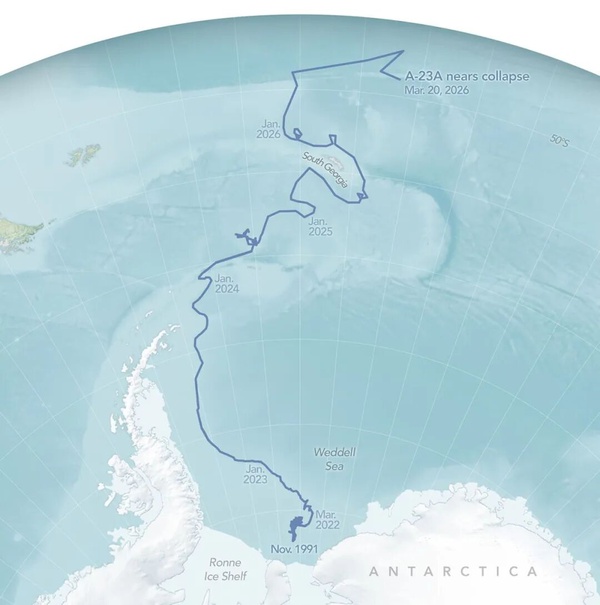 人们已经做好了准备。2026年,A23a依然在温暖的南大西洋上疾驰,许多媒体纷纷发出报道“全球最大的冰山,如今仅剩数周的寿命”。2026年3月5日,A23a冰山的面积已经缩减到了约180平方千米。