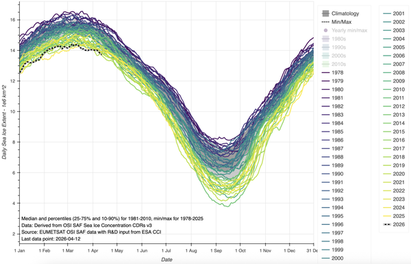 北半球海冰面积变化趋势图,每条线代表当年不同月份的海冰面积,颜色越偏紫色年份越久远,颜色越偏黄色年份越近,2026年的数据用黑色虚线表示。(图片来源:NASA)