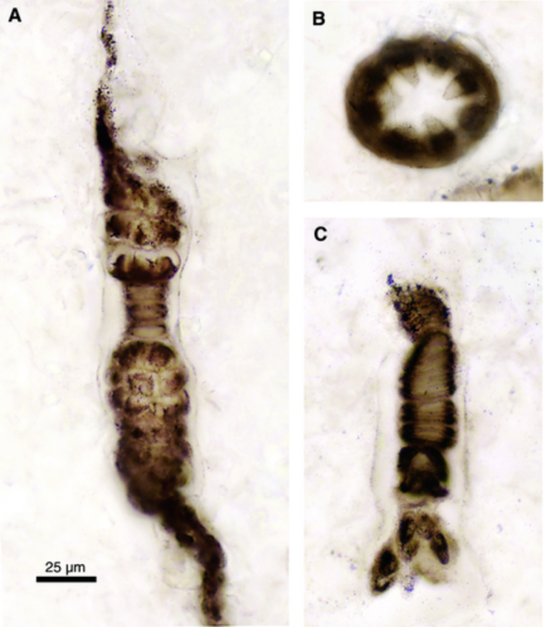 远古红藻Bangiomorpha pubescens的照片 图片来源于论文Early evolution of the Eukaryota