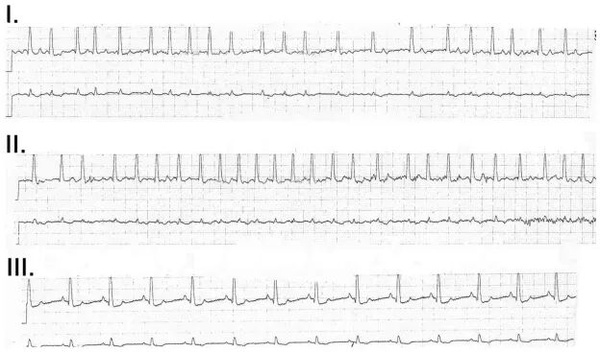 患者在直肠指检前(I,II)和直肠指检后(III)的心电图。(图片来源:Ruan, 2010.)